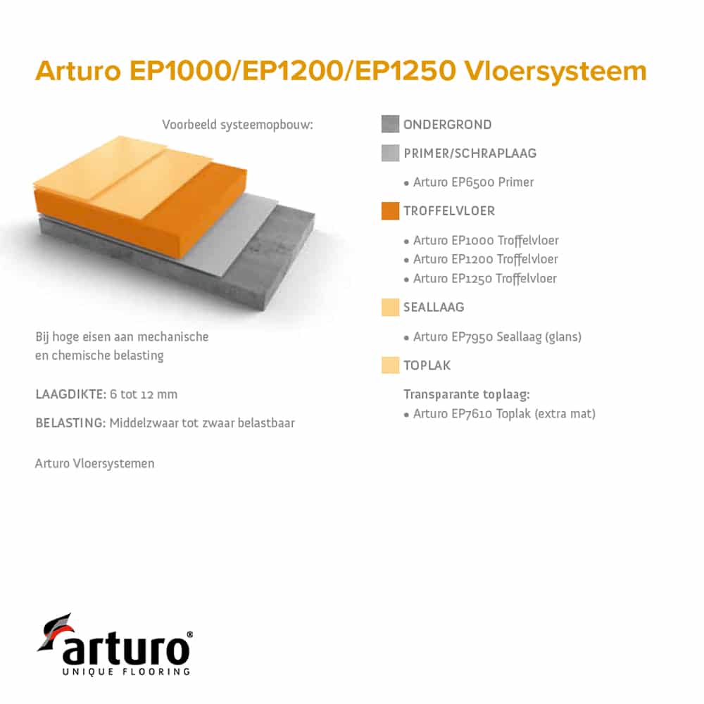 Arturo EP1000 Trowel floor est une finition de sol sans solvant, à 3 composants, à base de résine époxy et de charges minérales. L’épaisseur de la couche varie de 5 à 12 mm et est disponible en différentes couleurs.
